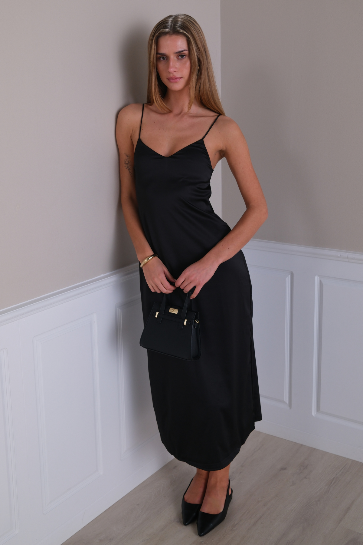 Immagina un vestito che passa senza soluzione di continuità dai pomeriggi incantati a sere incantevoli con solo un cambio di accessori. L'abito con cinturino Elina è quel sogno realizzato. La sua classica tonalità nera offre una tela di infinite possibilità, permettendo al tuo stile personale di brillare.